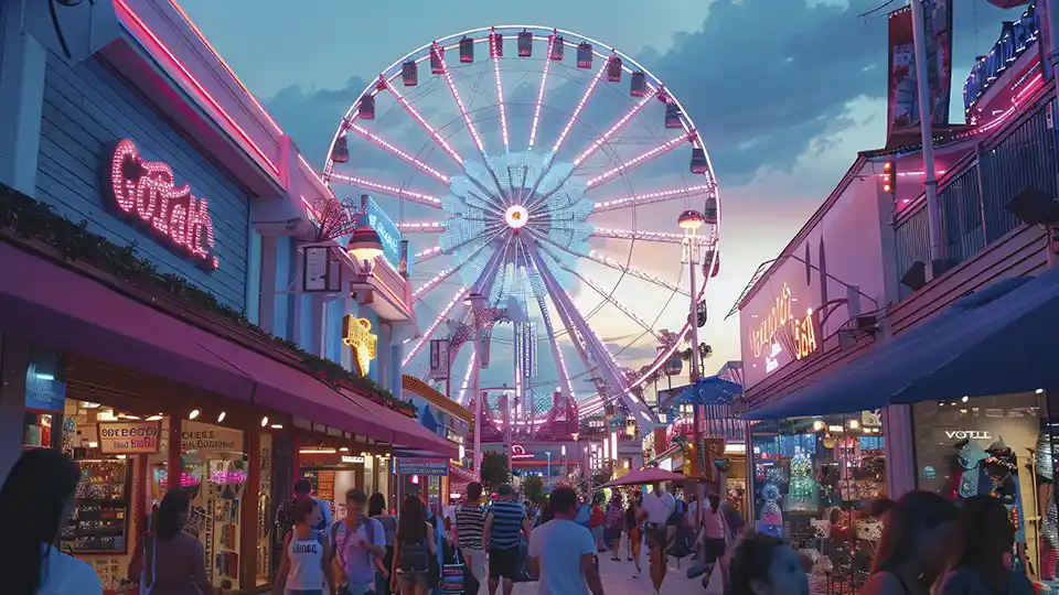 - Classic Funfair: Red and white tents, balloons, and game booths.